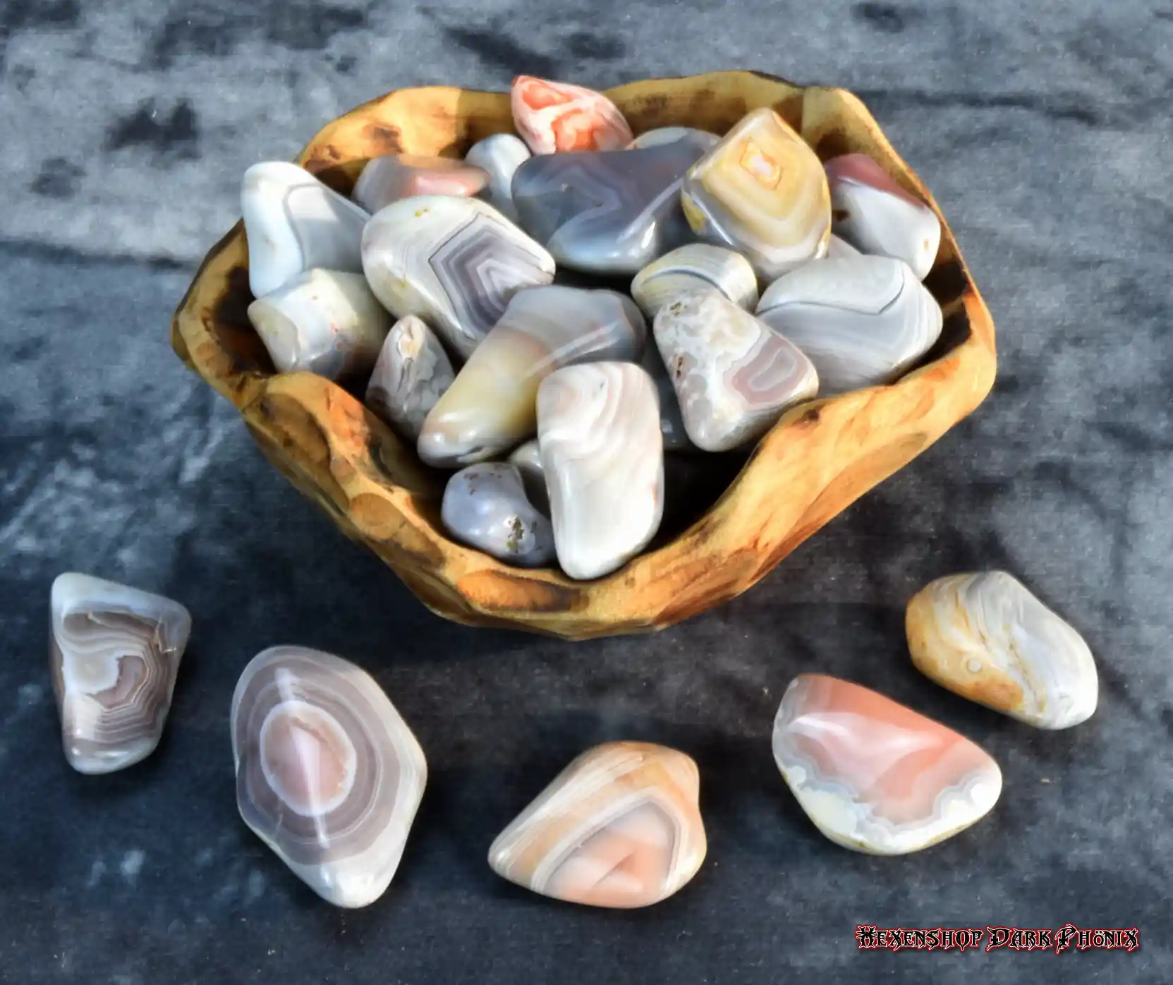 In seiner rohen Urform zeigt sich der Botswana-Achat oft in kühlen, nebligen Grautönen. Zarte Pfirsich- und Rosatöne des Achates sind in der Natur eine Rarität, der die verborgene Wärme des Steins weckt. Die feine, konzentrische Bänderung in Grau, Weiß und Braun verleiht ihm den Beinamen Schmetterlingsachat.