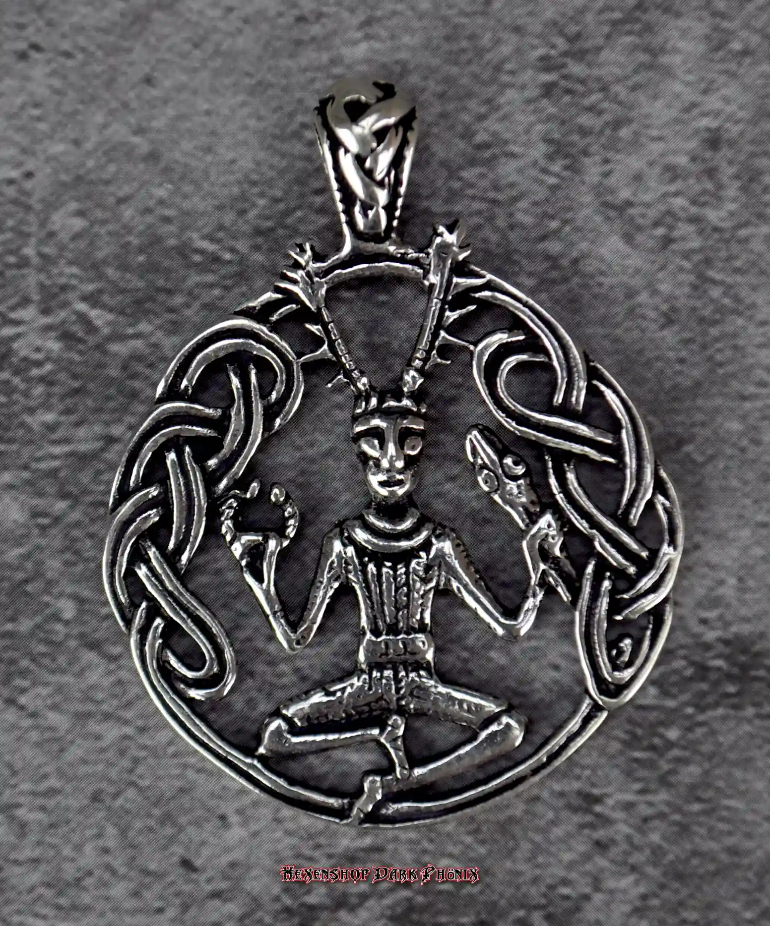 Ein filigraner 925er Sterlingsilber Cernunnos Anhänger, mit einer Schlange, die sich als keltischer Knoten um ihn im Kreis windet, einer Torques in der Hand und einem Hirschgeweih auf dem Kopf. Der Gott ruht im Schneidersitz. Die Rückseite ist poliert und man erkennt nur die Umrisse. Die Öse ist mit einem Knoten verziert. Er lagert auf einem Kraftplatz. Auch als Geschenk geeignet. Lasst Euch von der Vielfalt inspirieren, Eure eigenen starken Zauber zu kreieren. Hexenshop Dark Phönix: dark, darker, am darkesten )O(