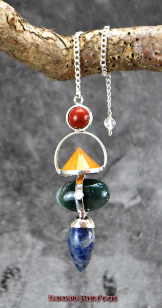 Ein einzigartiges fünf Elemente Pendel mit verschiedenen Halbedelsteinen an einer silberfarbene Kette. Am Ende der Kette befindet sich eine kleine Edelsteinkugel. Hier finden sich für das Element Feuer ein roter Jaspis, Element Luft gelber Aventurin, Element Erde Moosachat, Element Wasser Sodalith und für das Element Äther der Mondstein zusammen. Der Mondstein ist auf der Vorder- und der Rückseite des Pendels befestigt. Dieses Pendel ist beliebt bei Reiki Praktikern, Radanästhesisten, Heilpraktikern, Rutengehern, Homöopathen, Kartenlegern, Magiern, Hexen und anderen esoterisch arbeitenden Menschen. Einfach in der Handhabung und mit einem sensitiven Pendelausschlag. Es lagert auf einem Kraftplatz.
