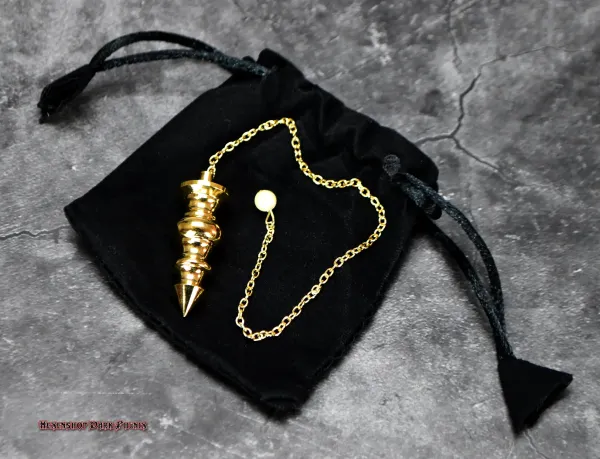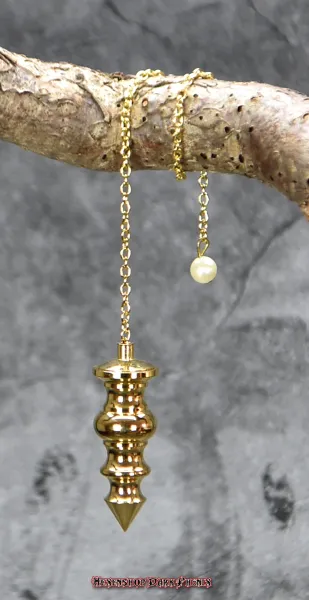 Ein großes Tempel-Messing-Pendel. Es liegt wunderbar in der Hand. Am Ende der Kette ist eine weiße Perlenkugel angebracht und wird mit einem schwarzen Säckchen geliefert.Dieses Pendel ist in der Radiästhesie beliebt bei Reiki Praktikern, Heilpraktikern, Rutengehern, Homöopathen, Kartenlegern, Magiern, Hexen und anderen esoterisch arbeitenden Menschen. Einfach in der Handhabung und mit einem sensitiven Pendelausschlag. Es lagert auf einem Kraftplatz.