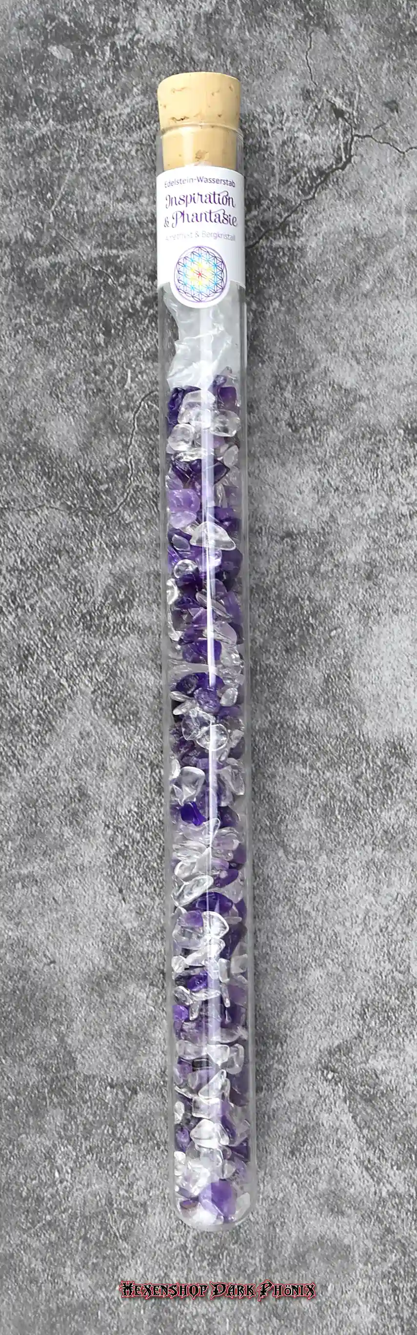 Dieser Edelstein Wasserstab Inspiration & Fantasie beinhaltet die Halbedelsteine Amethyst und Bergkristall. Das Reagenzglas ist ca. 25 cm lang, mit Korken. Die Reagenzglasmethode wird für die Energetisierung Eures Trinkwassers benutzt. Durch die Wassersteine kann sich das Wasser energetisch aufladen. Auch soll das Trinkwasser besser schmecken. Sie lagern auf einem Kraftplatz. Auch als Geschenk geeignet. Lasst Euch von der Vielfalt inspirieren, Eure eigenen starken Zauber zu kreieren. Hexenshop Dark Phönix: dark, darker, am darkesten )O(