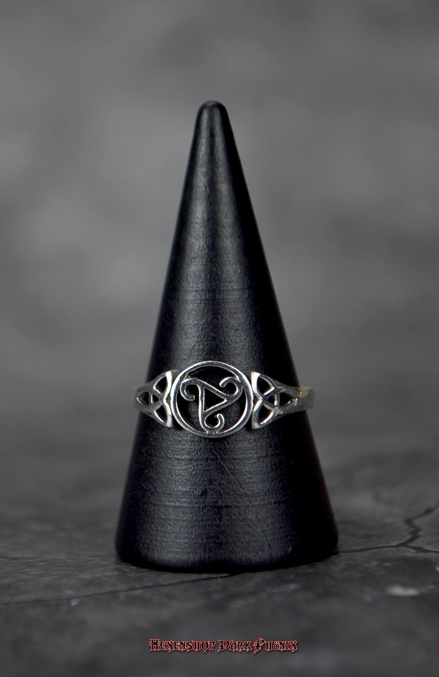 Ein filigraner 925er Sterlingsilber Ring mit Triskele und Triqueta. In der Mitte ist eine umrandete Triskele und zur jeder Seite ziert eine Triqueta das Motiv. Der Silbering lagert auf einem Kraftplatz. Auch als Geschenk geeignet. Lasst Euch von der Vielfalt inspirieren, Eure eigenen starken Zauber zu kreieren. Hexenshop Dark Phönix: dark, darker, am darkesten )O(