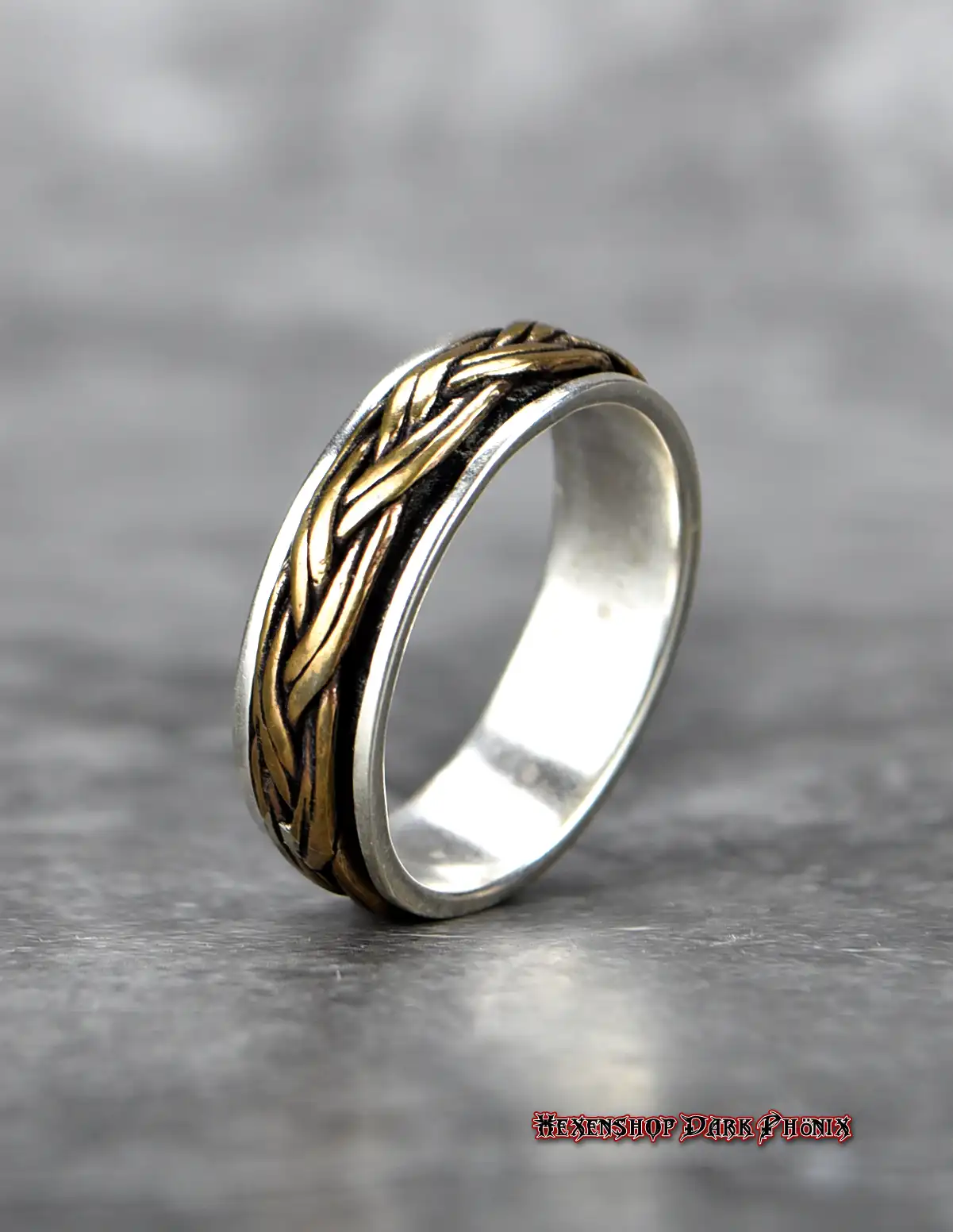 Ein robuster 925er-Sterlingsilber Ring mit in Bronze verbundenen keltischen Knoten. Das Motiv umrundet den Ring und kann man drehen. Der Silbering lagert auf einem Kraftplatz. Auch als Geschenk geeignet. Lasst Euch von der Vielfalt inspirieren, Eure eigenen starken Zauber zu kreieren. Hexenshop Dark Phönix: dark, darker, am darkesten )O(