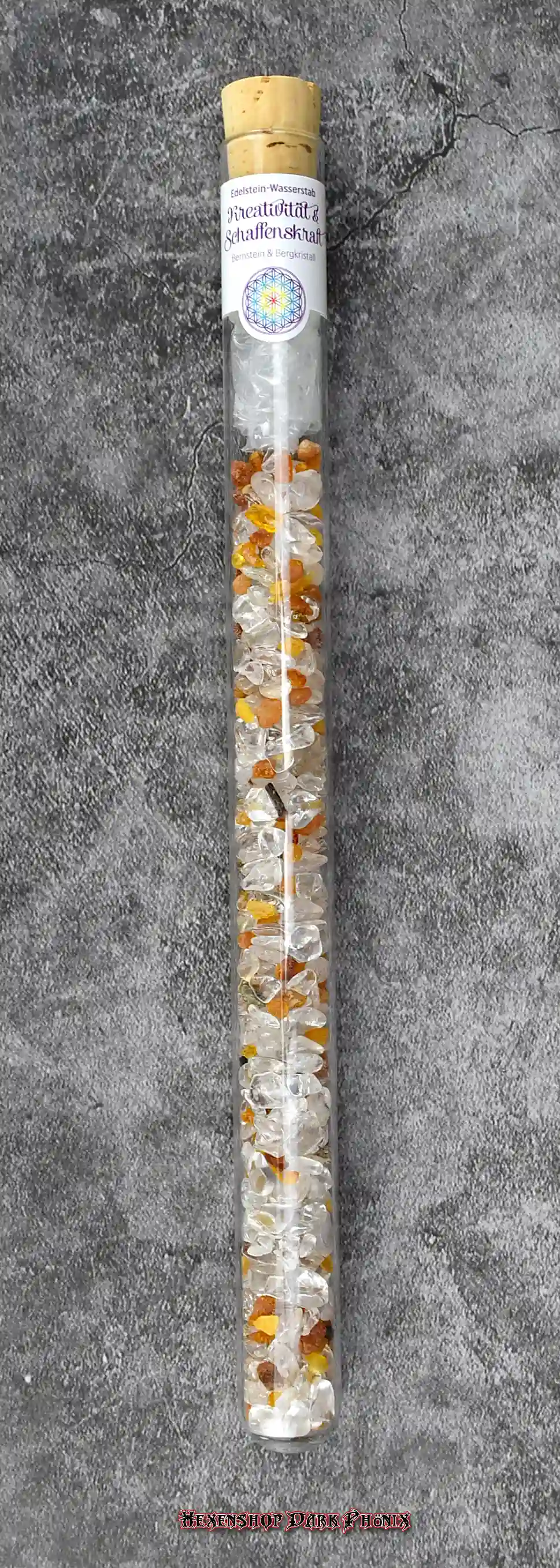 Dieser Edelstein Wasserstab Kreativität & Schaffenskraft beinhaltet die Halbedelsteine Bernstein und Bergkristall. Das Reagenzglas ist ca. 25 cm lang, mit Korken. Die Reagenzglasmethode wird für die Energetisierung Eures Trinkwassers benutzt. Durch die Wassersteine kann sich das Wasser energetisch aufladen. Auch soll das Trinkwasser besser schmecken. Sie lagern auf einem Kraftplatz. Auch als Geschenk geeignet. Lasst Euch von der Vielfalt inspirieren, Eure eigenen starken Zauber zu kreieren. Hexenshop Dark Phönix: dark, darker, am darkesten )O(