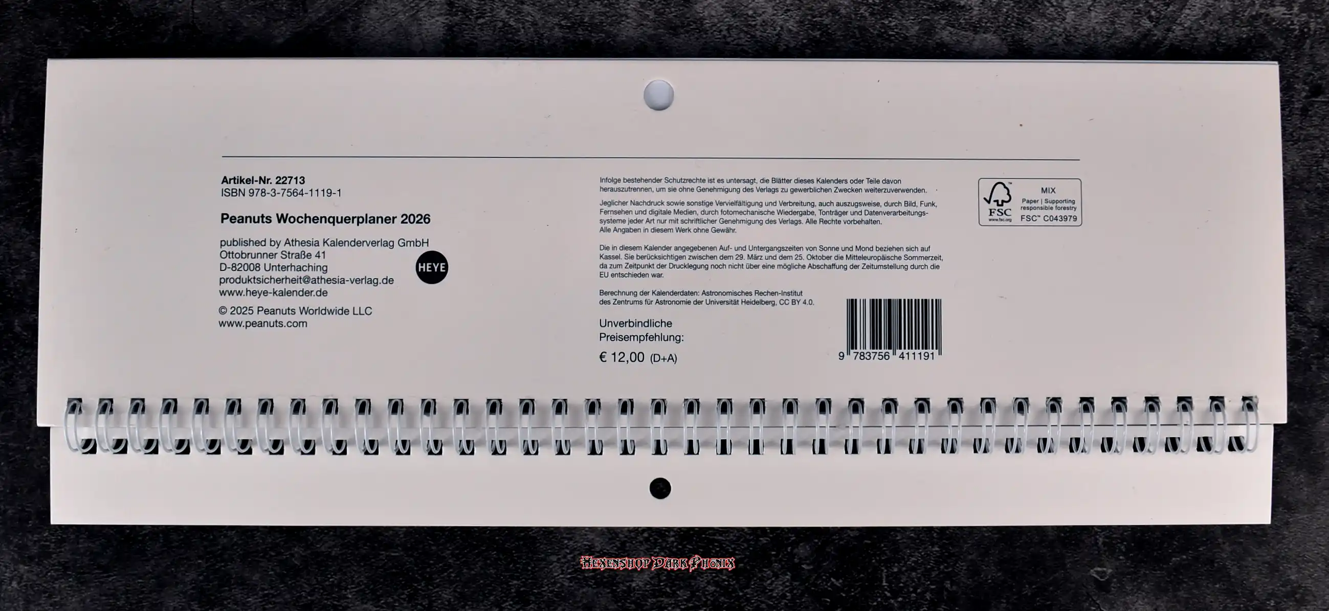 Ein wundervoller Tischquerkalender von den Peanuts für das Kalenderjahr 2026, so ist man Woche für Woche gut gelaunt im Arbeitsalltag. Hier findet Ihr tolle Cartoons mit den beliebten Peanuts Figuren, die Ihr 75-jähriges Bestehen feiern und somit mit Snoopy, Charlie Brown und Co. die Fans begeistern. In diesem Organisations-Allrounder ist viel Platz für Deine Eintragungen, so hast Du alles Wichtige auf einem Blick im Spiral-Wochenkalender.