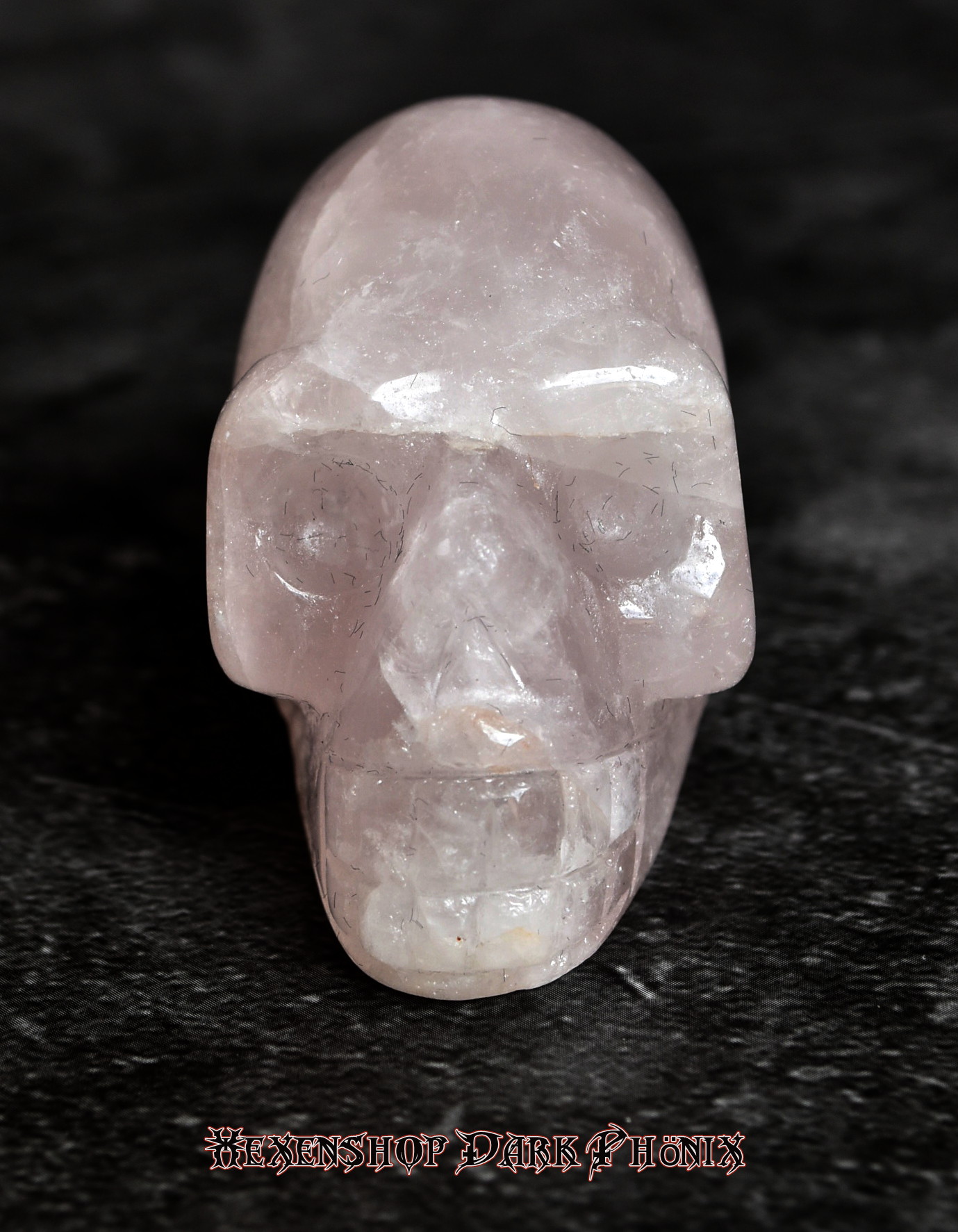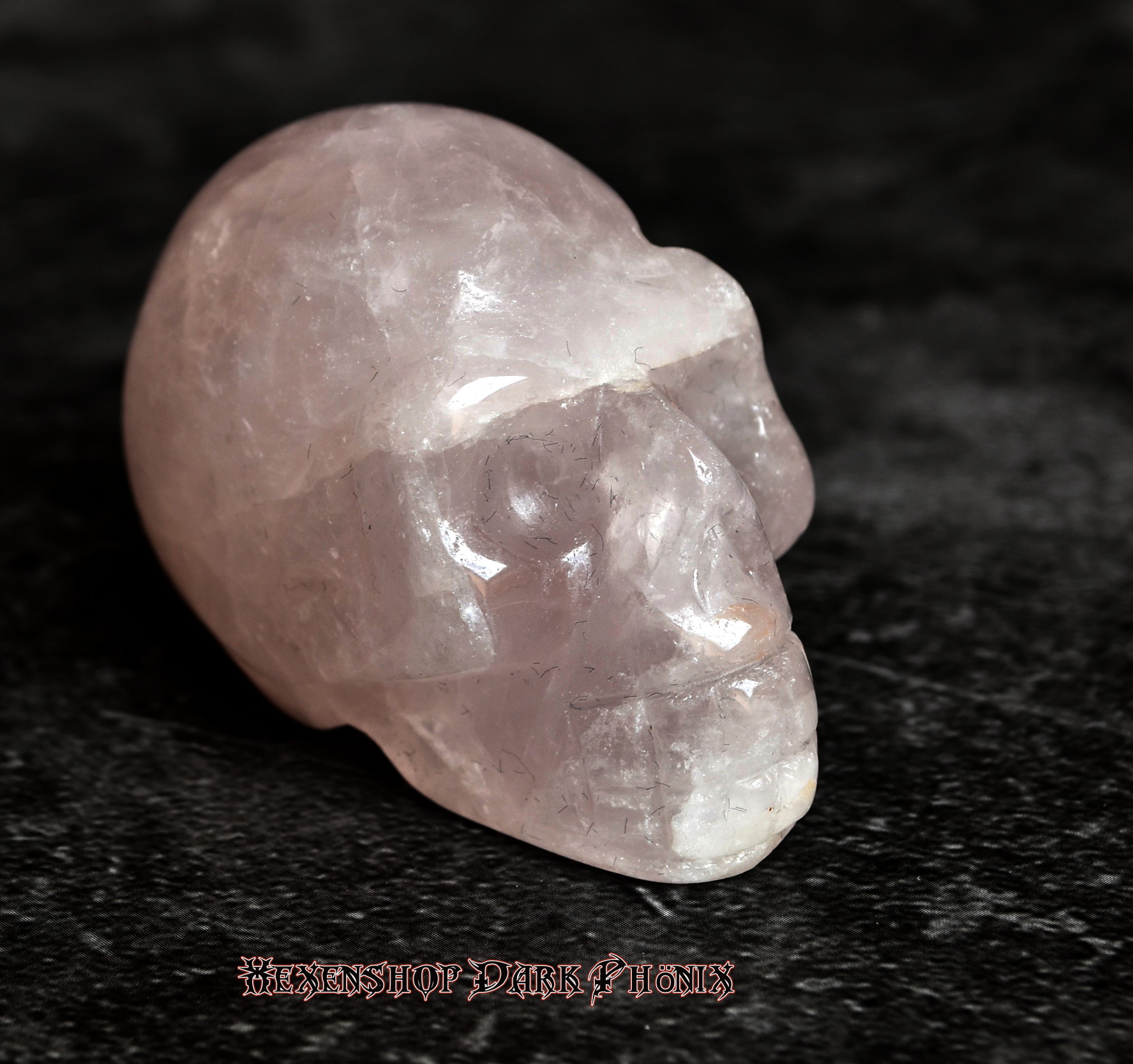 Ein exklusives kunsthandwerklich geschnitzter Totenschädel "Chors". Dieser besondere Kristallschädel wurde aus Rosenquarz handgefertigt und herausgearbeitet. Ein schwarzes Samtsäckchen wird mitgeliefert. Diese Handarbeit ist ein kleines Kunstwerk, die jede Wohnung erstrahlen lässt. So kannst Du stilvoll Deine Räume verschönern und energetisch aufwerten. Dieser Halbedelstein Totenschädel wird als Totenkopf oder Kristallschädel verwendet und von einem Hüter gepflegt und behütet. Sie lagern auf einem Kraftplatz. Auch als Geschenk geeignet. Lasst Euch von der Vielfalt inspirieren, Eure eigenen starken Zauber zu kreieren. Hexenshop Dark Phönix: dark, darker, am darkesten )O(