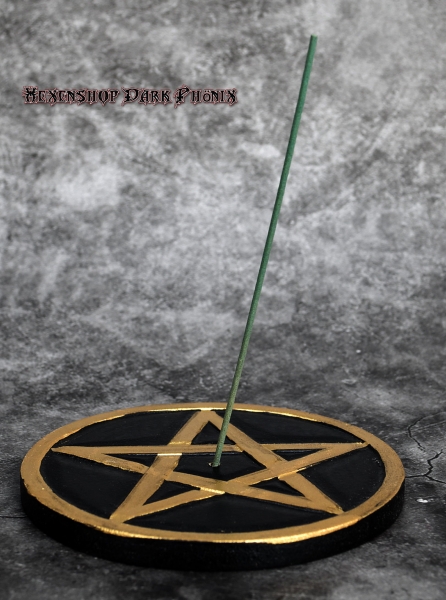 Dieser handgeschnitzte, runde Holz Räucherstäbchenhalter mit goldfarbenen Pentagramm ist für ein Räucherstäbchen geeignet. Durch das Pentagramm wird eine schützende Funktion zur Räucherung unterstützt. Ist für Räucherstäbchen, nicht für japanische und tibetische Räucherstäbchen geeignet.