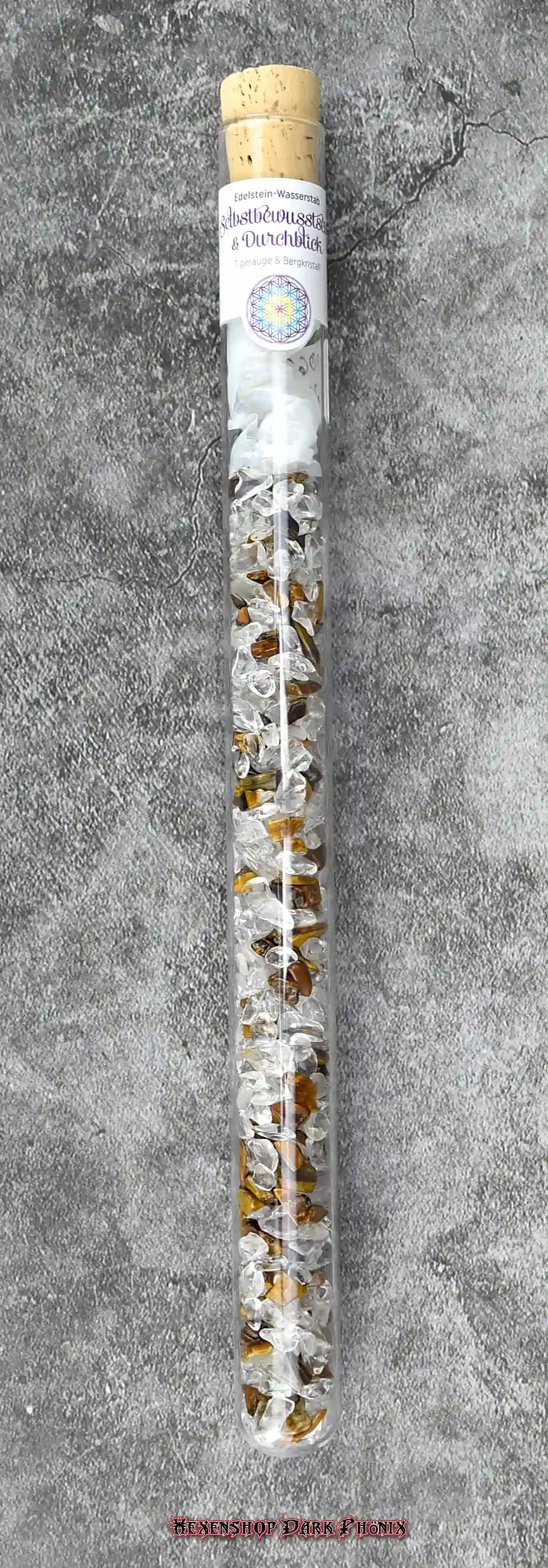 Dieser Edelstein Wasserstab Selbstbewusstsein & Durchblick beinhaltet die Halbedelsteine Tigerauge und Bergkristall. Das Reagenzglas ist ca. 25 cm lang, mit Korken. Die Reagenzglasmethode wird für die Energetisierung Eures Trinkwassers benutzt. Durch die Wassersteine kann sich das Wasser energetisch aufladen. Auch soll das Trinkwasser besser schmecken. Sie lagern auf einem Kraftplatz. Auch als Geschenk geeignet. Lasst Euch von der Vielfalt inspirieren, Eure eigenen starken Zauber zu kreieren. Hexenshop Dark Phönix: dark, darker, am darkesten )O(