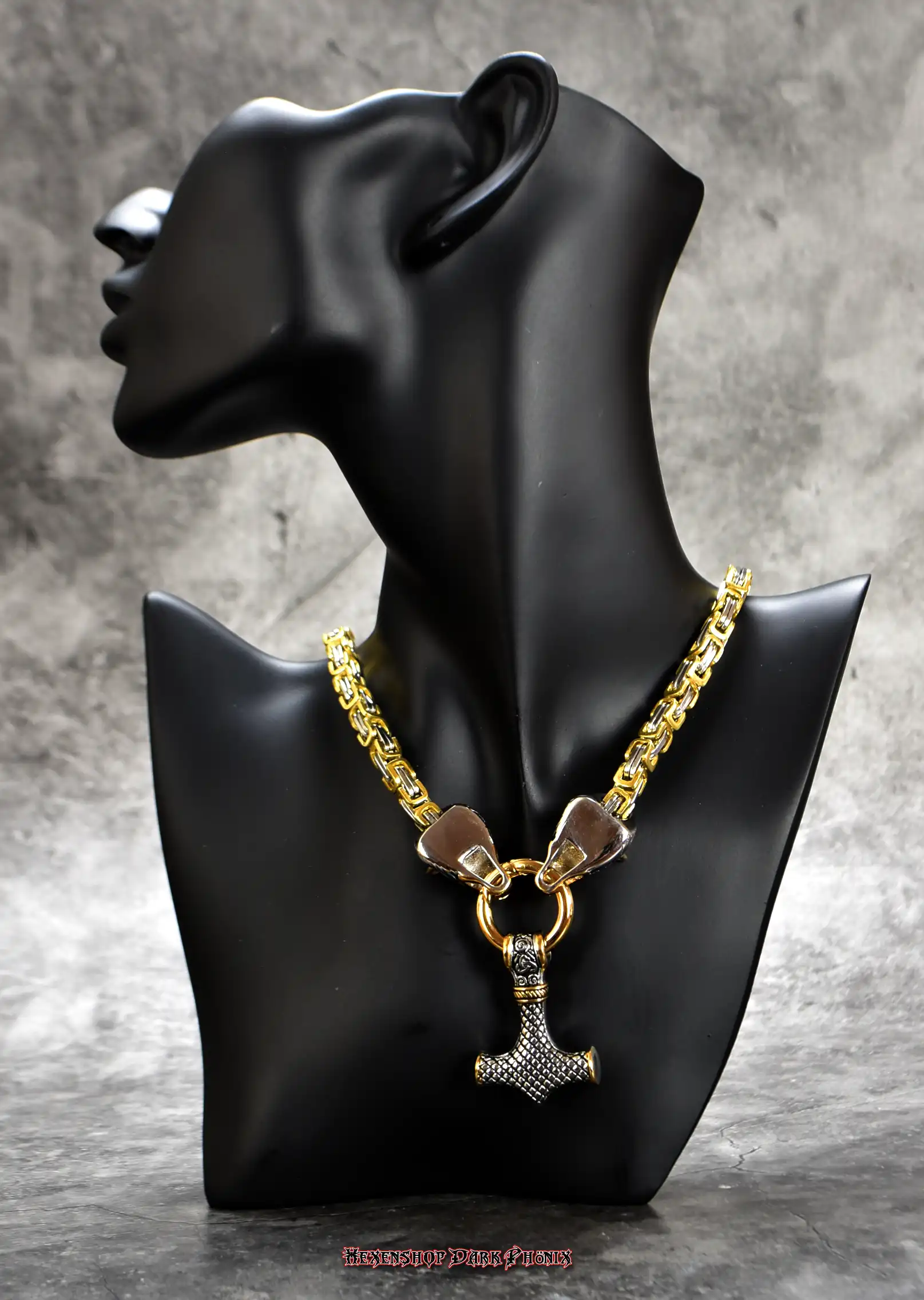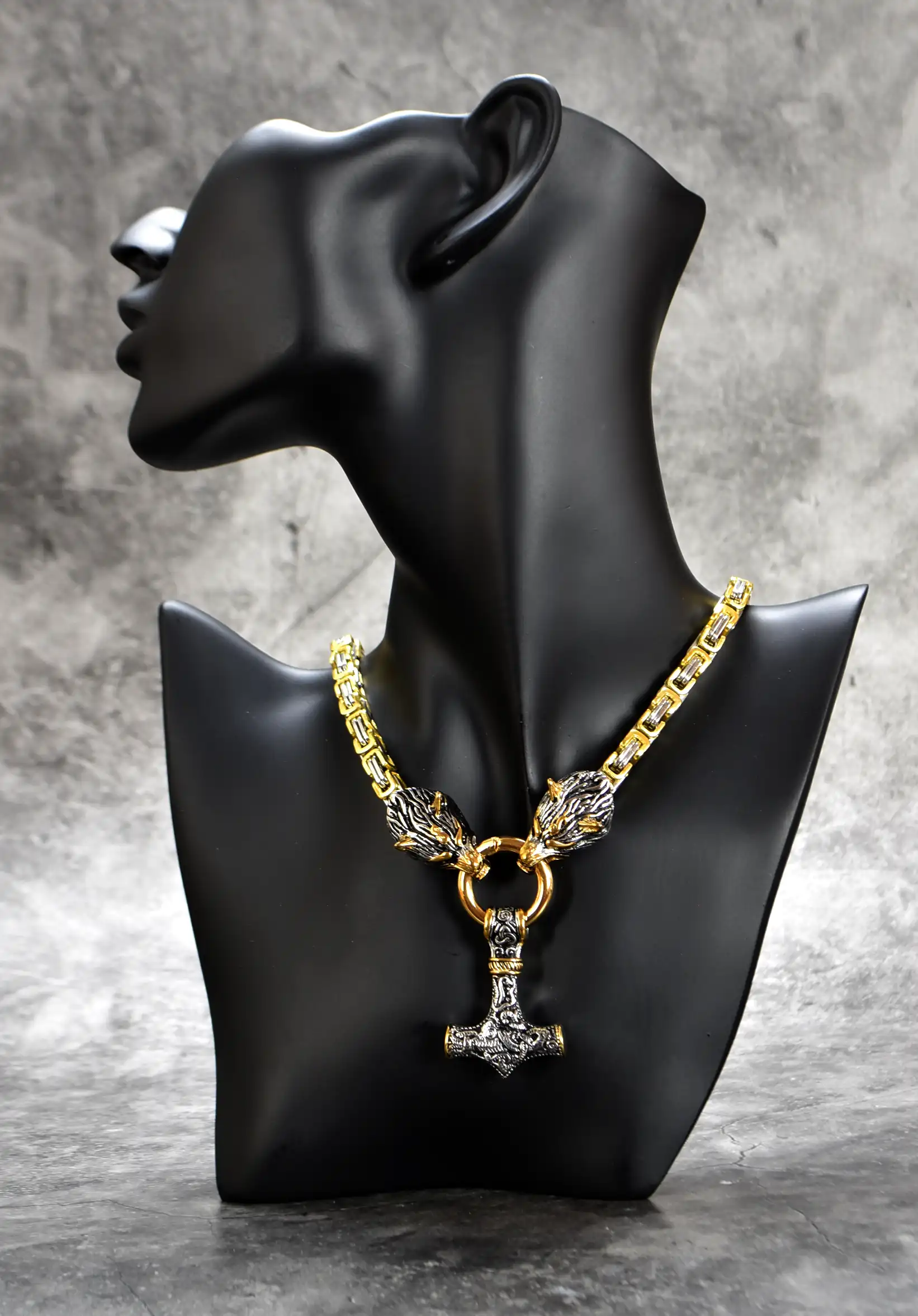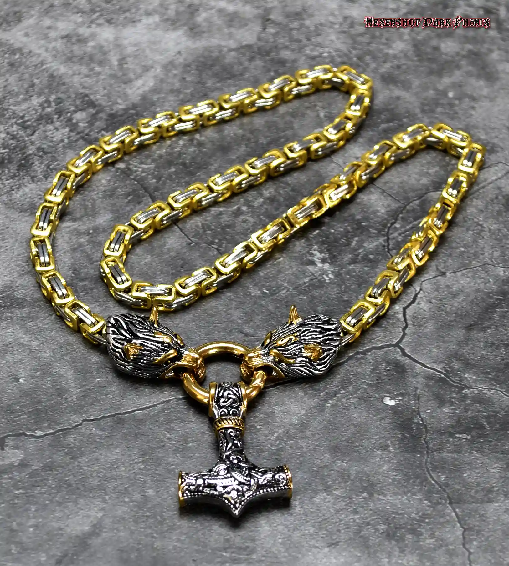 Massive Wikinger Edelstahl Königskette mit Thorhammer und zwei Wolfsköpfe von Sköll (Skalli) der die Sonne jagt und Hati der den Mond jagt, in silberfarben mit goldenen Akzenten. Der Thorhammer ist mit Jörmungandr und Triquetta auf der Vorderseite verziert. Auf der Rückseite ist eine Triquetta und ein Schlangenmuster eingraviert. Beide Seiten sind silberfarben und mit goldenen Akzenten abgesetzt. Dann folgt ein goldfarbener Ring, an dem der Thorhammer und die zwei Wolfsköpfe befestigt sind. Diesen kann man öffnen, um die Kette bequem um zu hängen. Die Wolfsköpfe sind wieder silberfarben mit goldfarbigen Akzenten. An den Wolfsköpfen ist die silberfarbene Königskette befestigt, die auch wieder goldene Akzente hat.