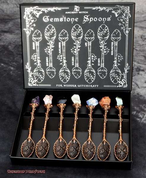 Hier könnt ihr auswählen, welchen bronzefarbenen, verzierten Zink-Räucherlöffel, der mit verschiedenen rohen Halbedelsteinen kombiniert ist, ihr zu Euren magischen Artefakten dazu haben möchtet. Der Stil ist einem Blütenstiel nachempfunden und am Ende mit einem rohen Halbedelstein besetzt. Der Laffe (Löffelschale) ist mit einem Blumenmuster verziert. Jeder Halbedelstein hat seine eigene Bedeutung und Energie, darunter findet Ihr Amethyst, Rosenquarz, schwarzer Obsidian, Bergkristall, Lapislazuli, roter Achat und grüner Aventurin. Für Harze, Kräuter, Hölzer, Wurzeln und Räuchermischungen geeignet, um sie gefahrlos auf die heiße Räucherkohle zu legen. Auch für das Abmischen, in Teilen gemessen, für Deine eigene Räuchermischung geeignet. Mit ihren eigenen Halbedelsteinenergien kann man sie auch in speziellen Ritualen einbinden.