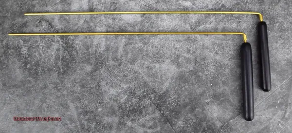 Ein feines Mutwerkzeug ist dieses Winkelrutenpaar mit schwarzem Mangoholzgriff und Messing Rute. Die Griffe der Wünschelrute sind unterschiedlich groß und dick, damit sie sich kreuzen können. Dabei hält man die Griffe so, dass beide Enden auf der gleichen Höhe sind. Du kannst mit ihm negativen Energien und Störquellen austesten. Für das Wahrsagen und die Zukunftsschau geeignet, wie für das Austesten von Homöopathika und anderen Naturheilmitteln, Kräutern, Halbedelsteinen und vielem mehr. Auch leistet es gute Dienste, um zwischen menschliche Befindlichkeiten auszuloten. Einfacher zu Handhaben als ein Pendel. Es lagert auf einem Kraftplatz.